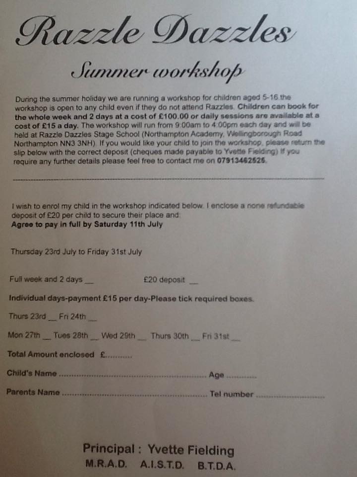 The workshop will run from 9am – 4pm each day and will be held at Razzle Dazzles Stage School, Northampton Academy, Wellingborough Road, Northampton, NN3 3NH.